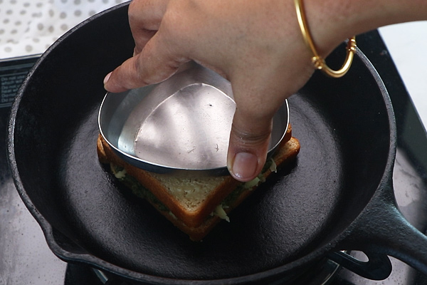 Pressing with a bowl or plate with flat base ensures sealing the sandwich intact. You can even use store bought pesto sauce. You can even add cooked or roasted chicken along with pesto sauce. Make sure to butter the inside so that the sandwich does not get soggy. The buttered surface will keep the pesto sauce intact without making the bread soggy. You can even add crumbled paneer or scrambled eggs as filling for this sandwich. Add colored bell pepper for a more colorful sandwich. Add cooked beans for a more wholesome and filling sandwich.
