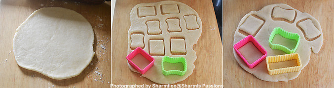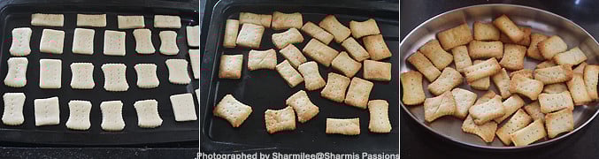 Do not knead too much just knead to bring it together thats enough else the cookies will turn out hard. Do not roll thick. These biscuits are mildy sweet, if you want increase sugar. You can jeera / ajwain for flavored biscuits. The timing depends on the thickness of the cookies so keep an eye after 10mins, when it starts to brown at the edges switch off. Keeps well for about a week in airtight container. My cookie cutters are very small so got many cookies.So the quantity depends on the type and size of cookie cutter you use. I did not have butter paper so baked directly in the tray but I recommend laying a baking sheet / butter paper / aluminium foil