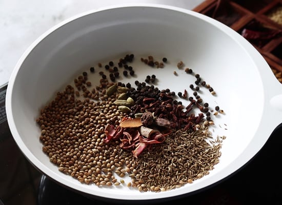 To begin with first roast all the spices until golden finally add kasoori methi give a quick saute, switch off. Cool down completely, grind to a slightly coarse mixture. Then add all the spice powders, give a quick blend. Cool down completely then store in a clean dry container.