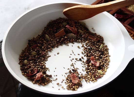 You can roast kashmiri red chillies along with other spices. Instead add red chilli powder as I’ve did. I just grated nutmeg and added, you can add half nutmeg while powdering.